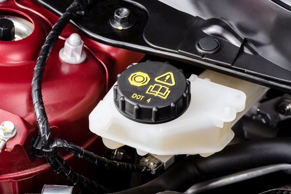 Stabdžių skysčio bakelis yra horizontaliai stabdžių pedalui į viršų, t.y. toje vietoje kur yra stabdžiai, yra stabdžių skysčio bakelis. Ant bakelio žymimas simbolis "stabdžių būgnas su šalia esančiomis kaladėlėmis".