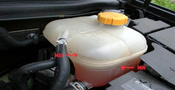 Ant aušinimo skysčio bakelio yra žymos MIN ir MAX. Aušinimo skysčio neturėtų būti daugiau nei MAX, ar mažiau nei MIN.