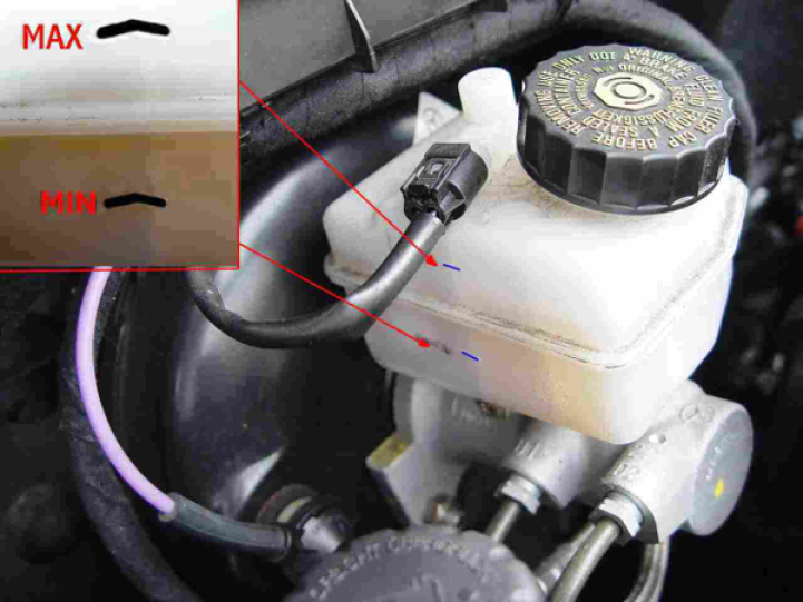 Ant stabdžių skysčio rezervuaro yra žymos MIN ir MAX, stabdžių skysčio neturėtų būti daugiau nei MAX, ar mažiau nei MIN.