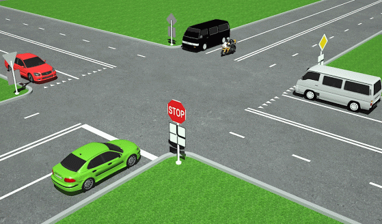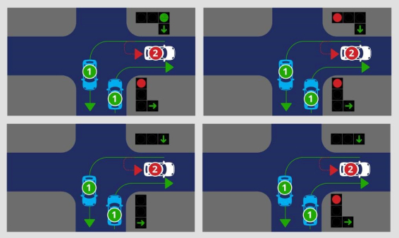 Žemiau pateiktoje situacijoje, pirmas važiuoja mėlynas automobilis, nes jis yra pagrindiniame kelyje. Žalias automobilis, taip pat yra pagrindiniame kelyje, tačiau sukdamas į kairę, vairuotojas privalo duoti kelią mėlynam automobiliui, važiuojančiam lygiareikšmiu keliu priešinga kryptimi, nes šis yra jam iš dešinės pusės. Paskutinis per sankryžą važiuos raudonas automobilis, nes jis yra kelyje pažymėtame kelio ženklu „Duoti kelią“.