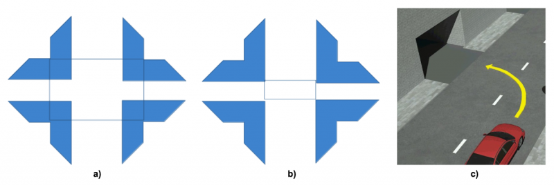 Pav.: a) sankryža; b) važiuojamųjų dalių sankirta; c) šalia kelio esanti teritorija