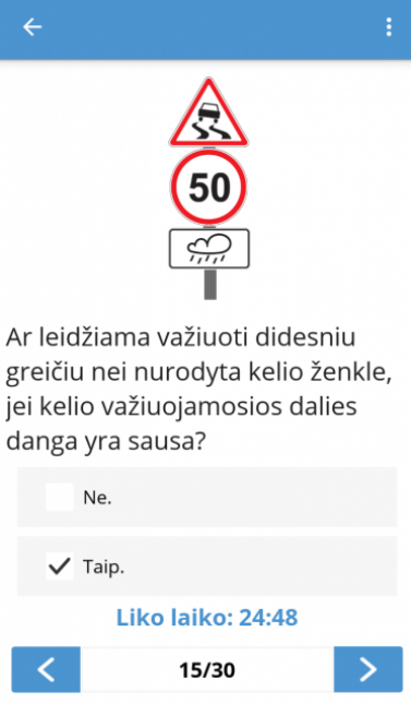 Man tai labai padėjo ši aplikacija. Šiandien kaip tik laikiau egzaminą Regitroje ir išlaikiau iš pirmo karto surinkusi 90 proc. Kai kurie klausimai nebuvo matyti, tačiau didžioji jų dalis buvo spręsti per šią programą. Taigi, tikrai rekomenduoju, nenusivilsit. Tiesa sakant, čia klausimai apie važiavimus per sankryžas yra daug sudėtingesni negu kad sprendžiau per egzaminą.